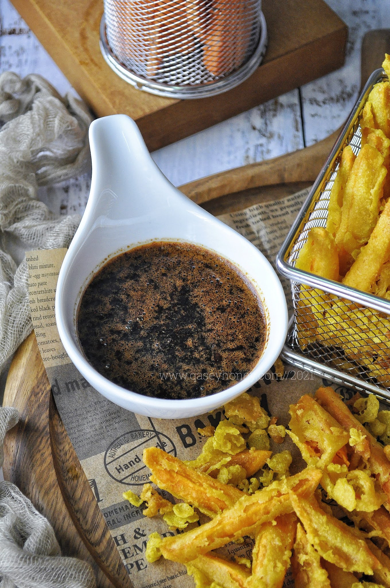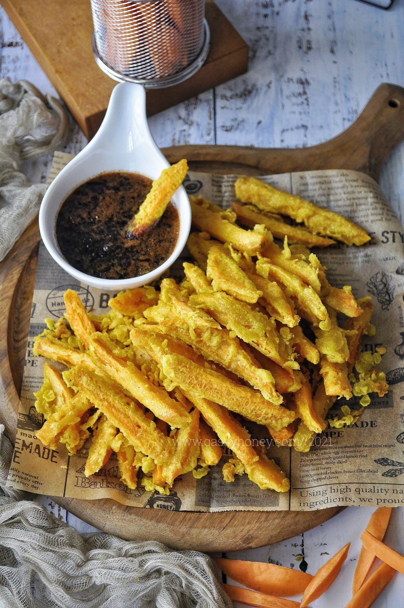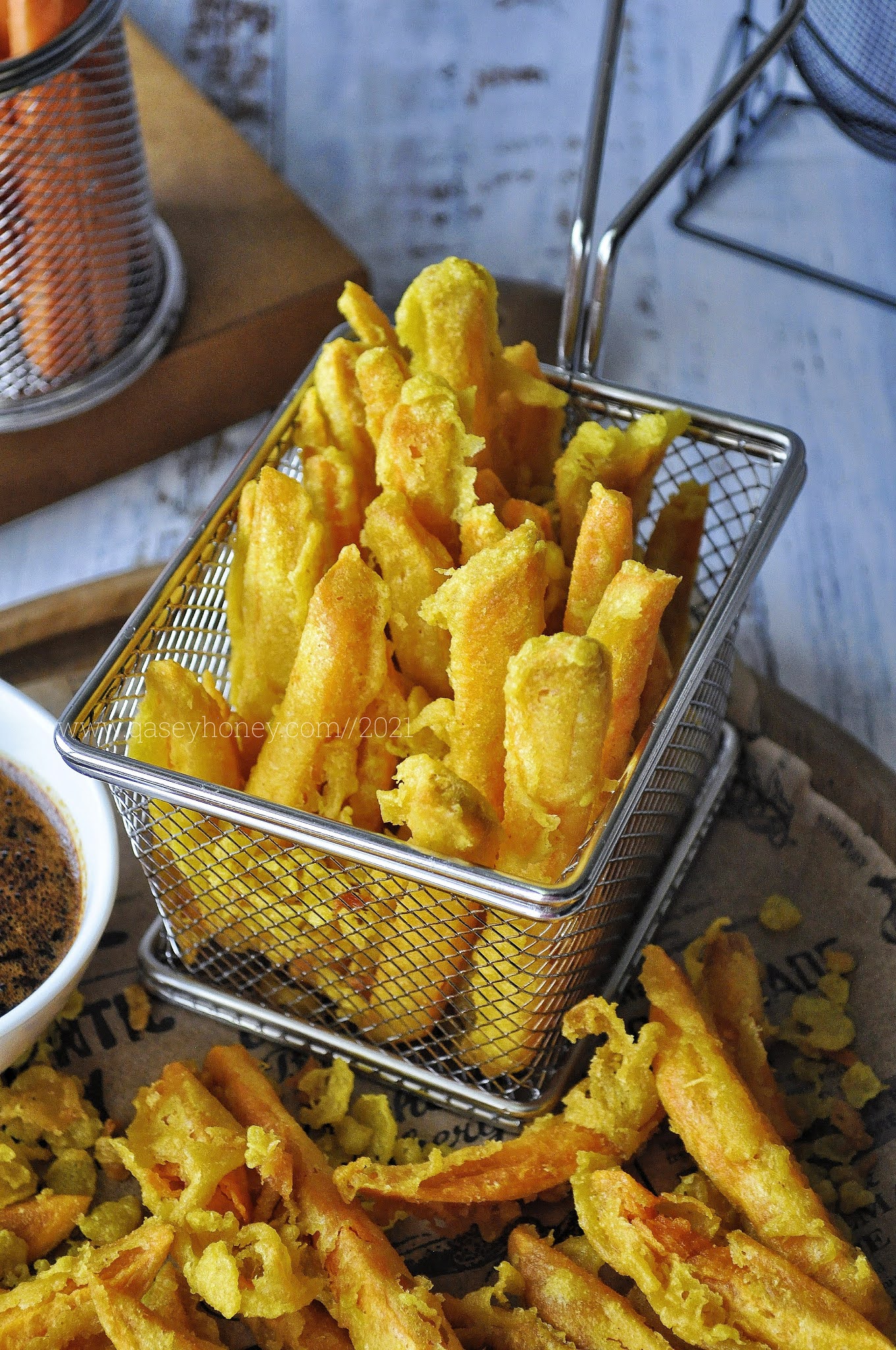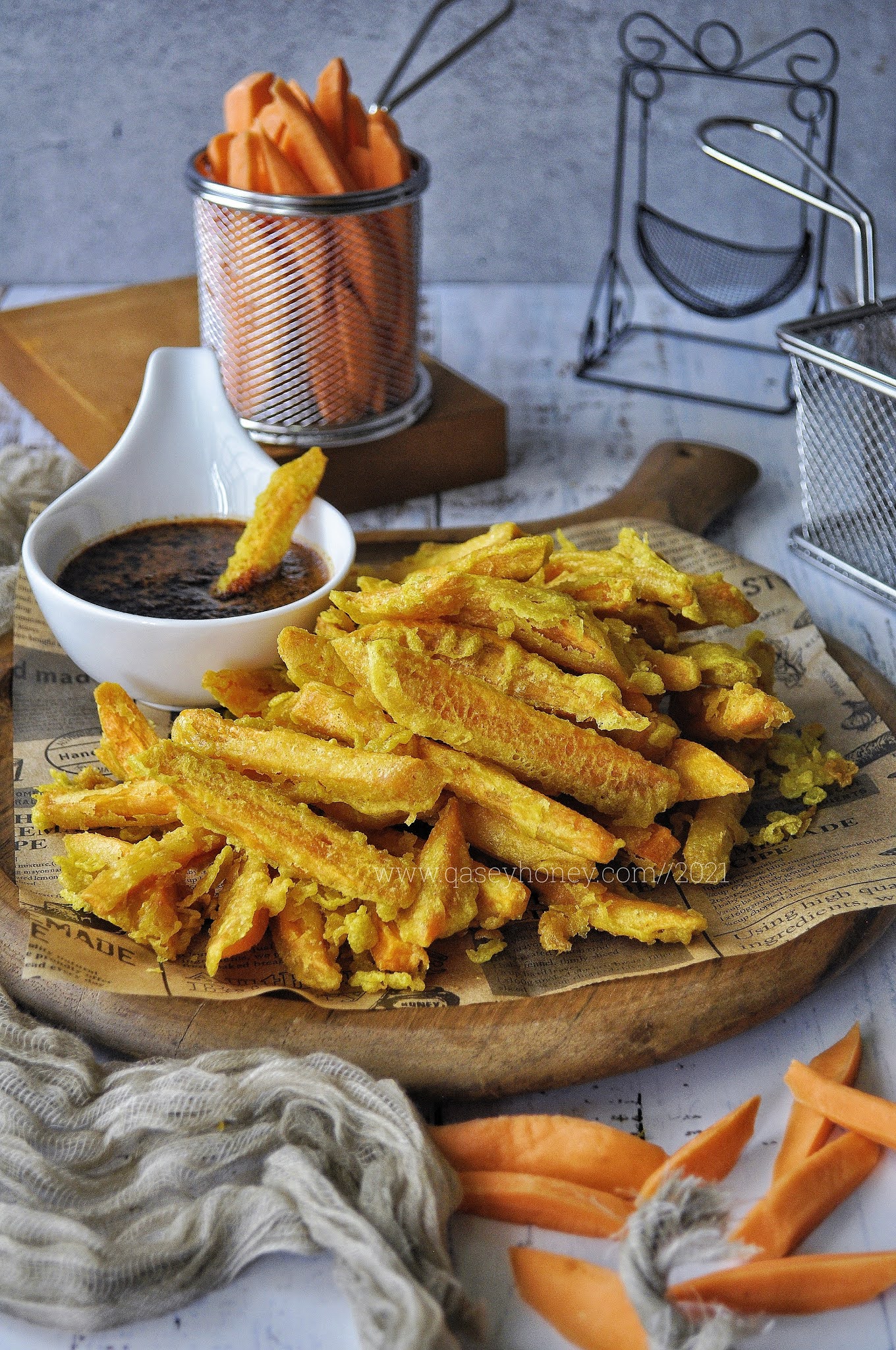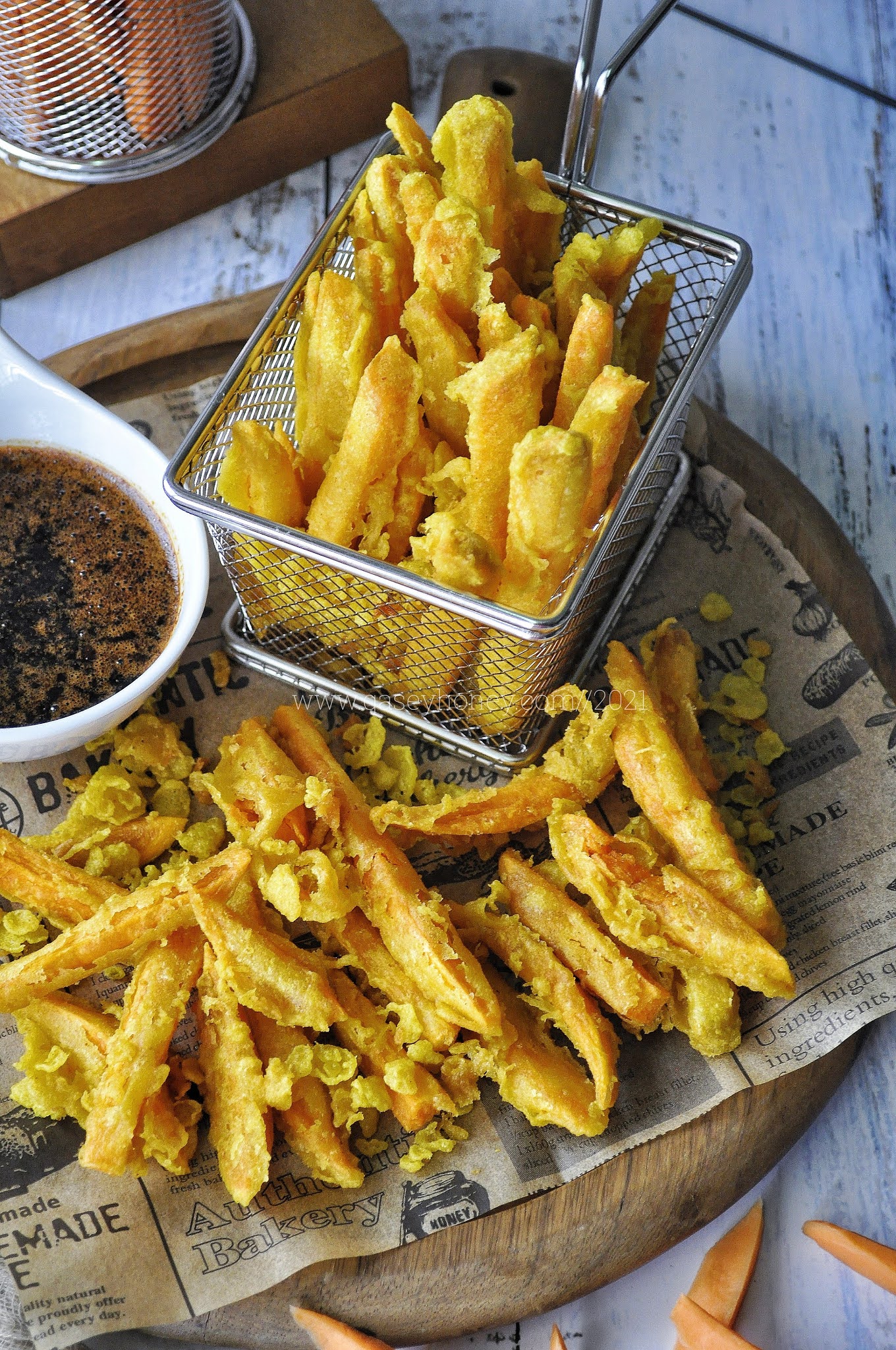 5. Goreng jejari keledek sehingga kuning keemasan. Angkat & tos. Hidangkan bersama dengan sambal kicap.