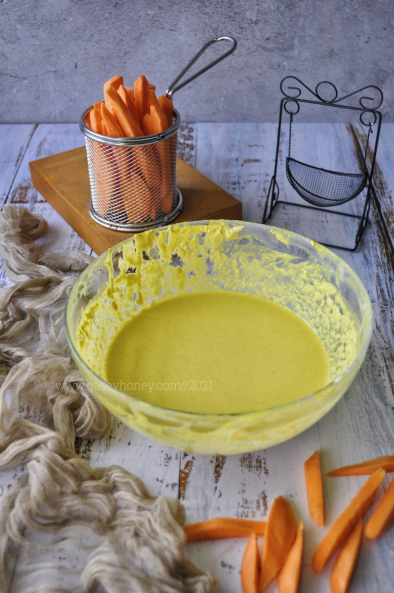 3. Panaskan minyak secukupnya dengan api sederhana. Masukkan keledek ke dalam batter. Gaul rata.